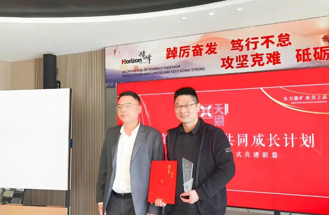 在2025 年第一季度中天诩临沂地区费县经销商岳立镇业绩斐然。为表彰其贡献,赫峰集团负责人赵永明先生为岳立镇先生颁发荣誉奖杯及证书,以肯定其在市场开拓营等方面取得的突出成就,此举也为其他经销商树立了可借鉴的标杆。