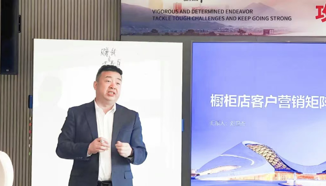 天诩品牌运营管理中心负责人刘卫杰的登场将会议推向高潮。刘卫杰凭借丰富的实战经验与众多成功案例,为经销商们带来一场关于橱柜店终端销售技能的干货盛宴。他围绕客户类型划分、客户行为特征与营销话术,营销矩阵构建等方面,进行了细致入微的讲解。同时,刘卫杰深入剖析天诩终端店赋能体系,从天诩提供的品牌支持、客户管理系统到售后服务标准化等多维度,助力经销商清晰认知借助天诩优势资源,全方位赋能终端店的运营效率与市场竞争力,实现销售业绩的持续增长。