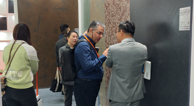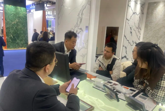 天诩石英玉石板材不仅设计独具匠心,实用性方面更是表现卓越。其耐磨、耐刮、易于清洁打理的特性,温润如玉的质感,让烟火岁月痕迹也变得柔和而美好。无论是应用于台面、地面还是墙面装饰,都能完美展现其独特魅力。展会现场,来自意大利、土耳其、伊朗、印度、巴西、西班牙等多国外商对天诩石英玉石温润质感及多元化应用前景给予高度评价并达成合作意向。